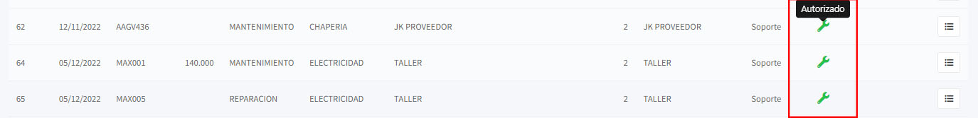 En el Estado 2, una vez que se autoriza la Orden de Trabajo, el estado cambia de SOLICITADO a AUTORIZADO y se muestra un ícono de una llave de color VERDE. En este punto, ya es posible registrar compras relacionadas con el trabajo abierto.