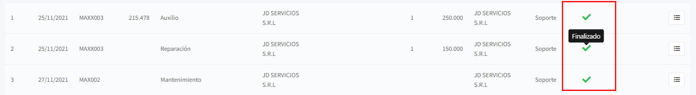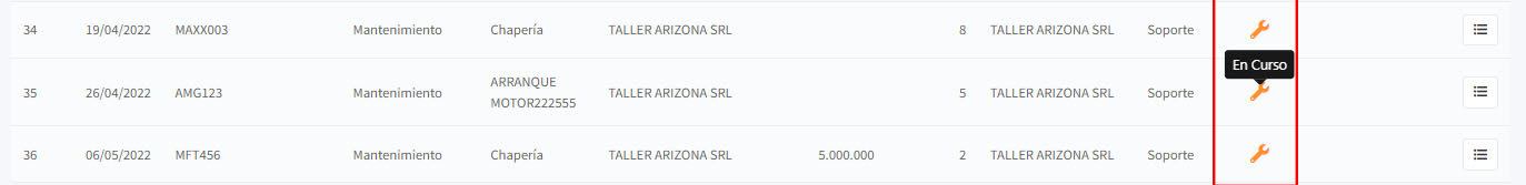 En el Estado 3: se inician los trabajos solicitados y autorizados, lo que hace que el estado cambie a EN CURSO. En este estado, el ícono de la llave cambiará de color verde a naranja.