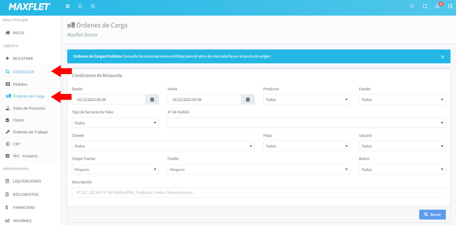 En el menú logística selecciona la opción Consultar, Una vez dentro del menú de consulta, selecciona la opción Orden de trabajo y accederás al formulario correspondiente.