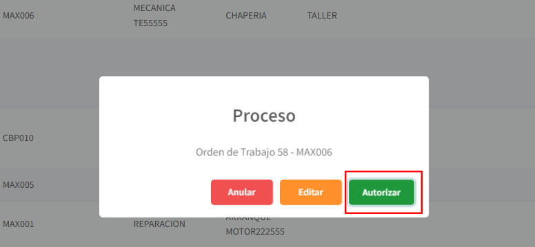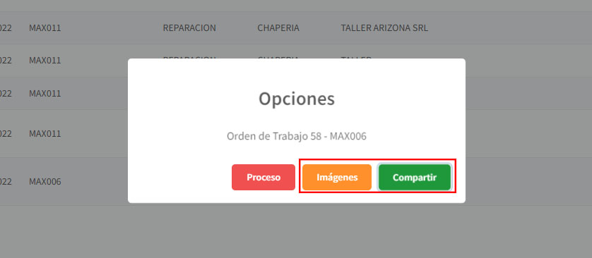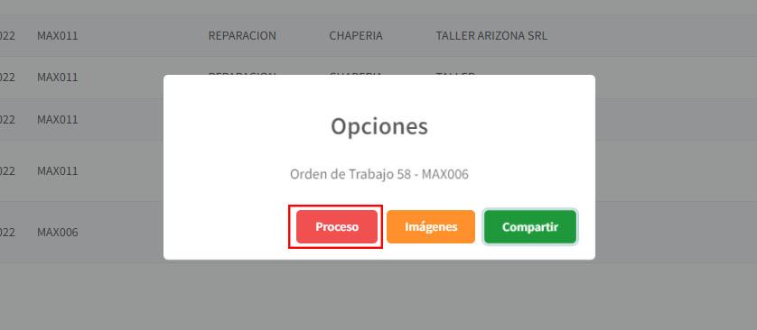 Tendremos tres opciones: Proceso, Imágenes y Compartir. Si hacemos clic en Proceso, se nos mostrará las opciones de anular, editar o cambiar el estado de una Orden de Trabajo.