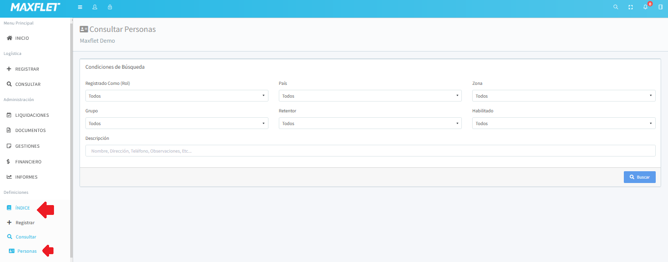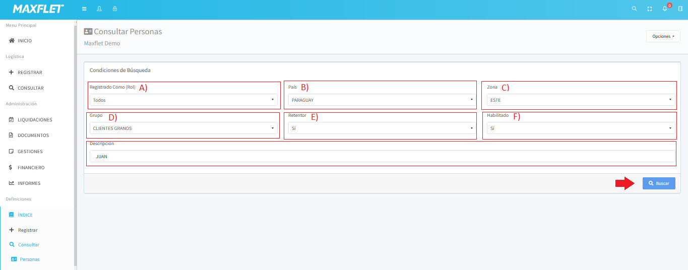 Condiciones de búsqueda:A)Registrar como (Rol): Aqui indicamos un rol especifico para buscar, chofer, cliente o proveedorB):Pais: El pais de la persona a buscar C):Zona:---------D):Grupo:----E):Retentor:-----------F):Habilitado:-----G):Descripción: