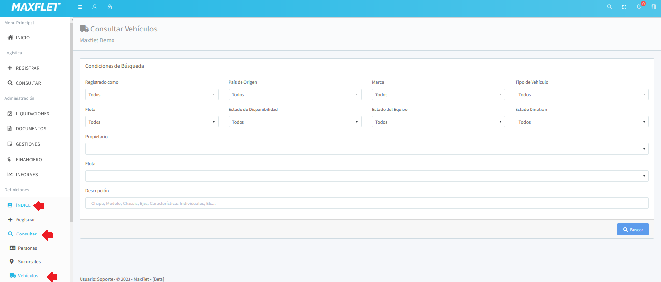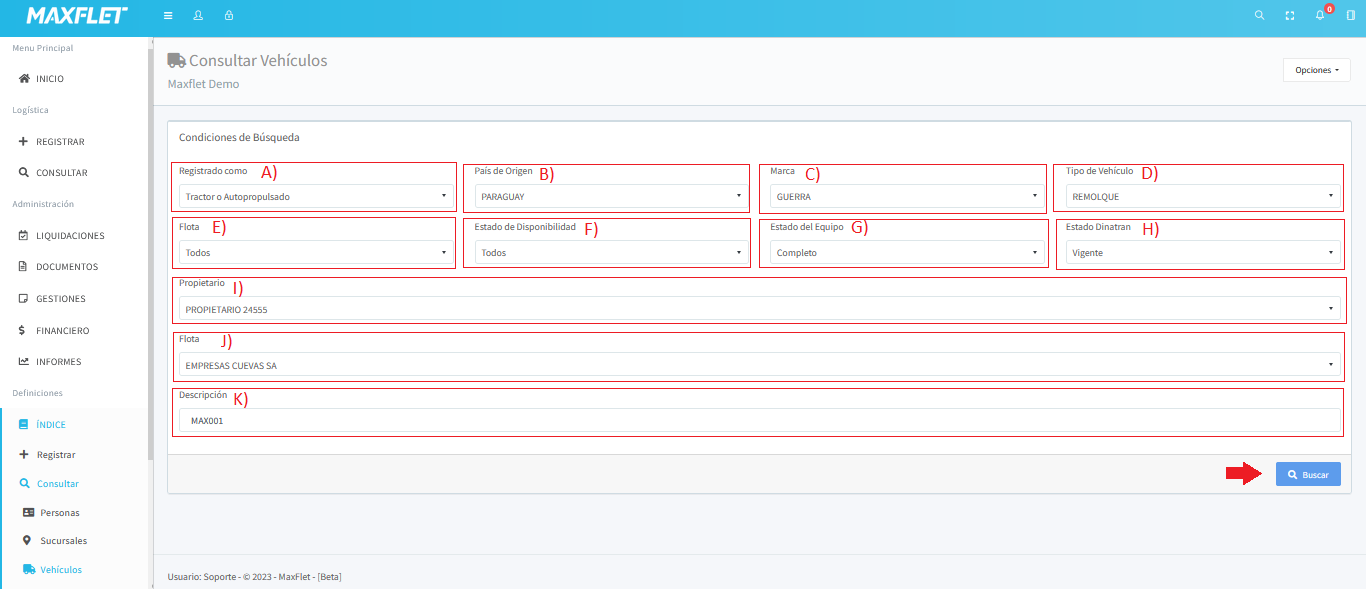 Todos:Tractor:Carreta:B)País de Origen: Incluirá solo el país de origen seleccionado C)Marca: Buscar por un tipo de marca del vehículo D)Tipo de Vehículo: Por tipo de vehículoE)Flota:Todos:Propios: Camiones propiosTerceros: Camiones de terceros F)Estado de Disponibilidad: Seleccionar el estado del camión, activo, en mantenimiento..etc. G)Estado del Equipo: Puede ser con chofer, sin chofer,o algunas de las opcionesH)Estado de Dinatran: Por ej.:vencidos, vigentes, y otrosI)Propietario: Esta opcion pemite buscar todas los vehículos de un propietarioJ)Flota: La empresa que habilita el transito internacionalI)Descripción: En este campo podemos escribir una fracción de la descripción a buscar