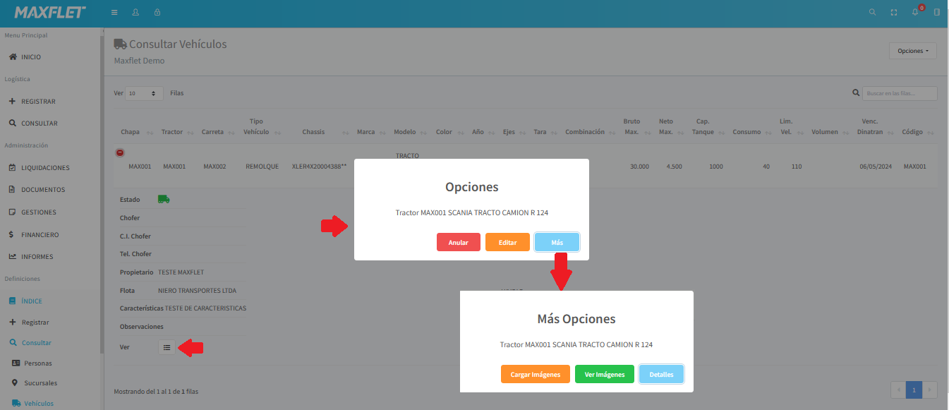 Cargar Imágenes: Esta opción permite cargar foto del vehículoVer Imágenes: Aquí podemos visualizar la foto del vehículoDetalles: En este boton podemos encontrar el usuario que registro el vehículo