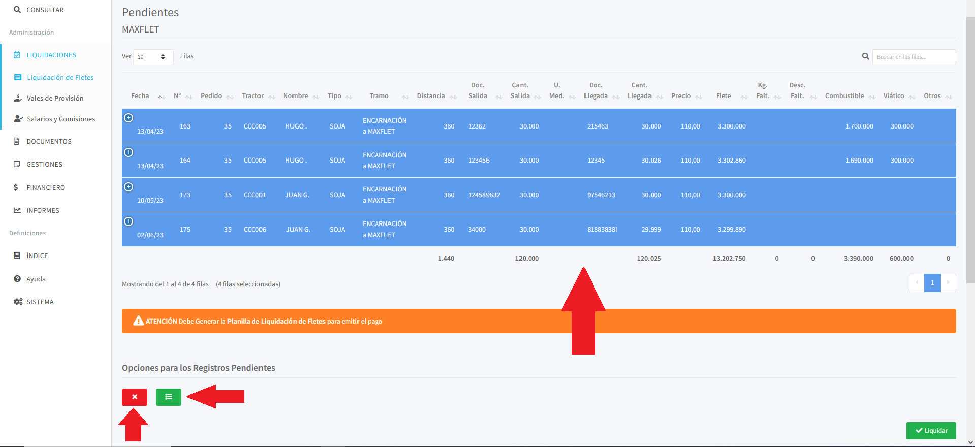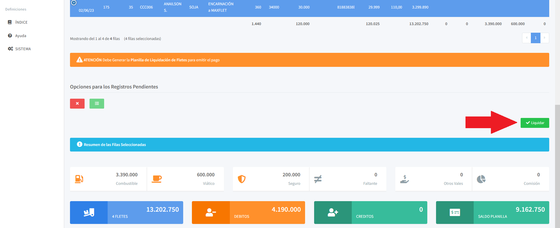 Recuerde que antes de hacer clic en el botón "Liquidar", asegúrese de haber seleccionado correctamente los fletes que desea incluir en la planilla. Puedes verificar los registros seleccionados en la lista y asegurarte de que son los que deseas liquidar.