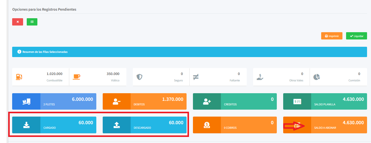 Este resumen le brindará una visión general de los fletes seleccionados y le ayudará a tener un panorama mas claro de los detalles antes de proceder con la liquidación y el cobro.