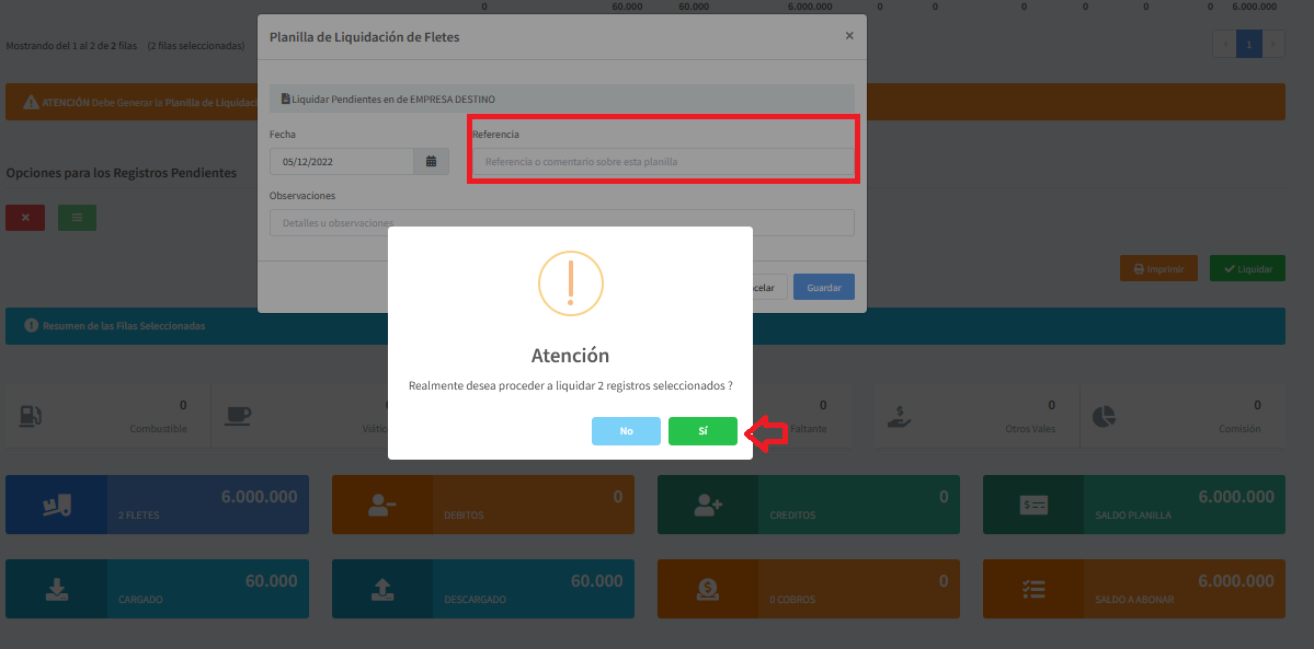 Para planillar los fletes seleccionados, simplemente haz clic en el botón "Liquidar". Esto iniciará el proceso de planillado de los registros seleccionados y calculará el total a cobrar.