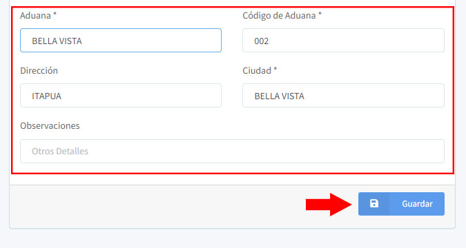 A continuación completamos la aduana, código, dirección, ciudad y en caso de que hubiere alguna observación. Luego damos clic en "Guardar"
