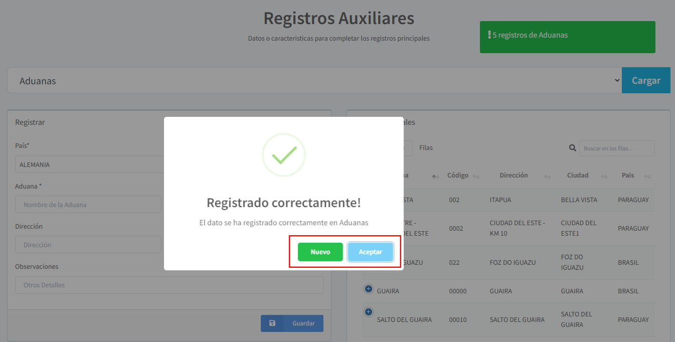 El sistema confirmará que la aduana se ha registrado correctamente. Para registrar una nueva aduana damos clic en "Nuevo"