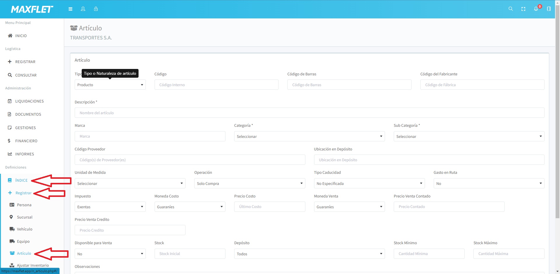 Dirígete al menú definiciones y selecciona Índice. Dentro del menú Índice, elige la opción Registrar. A continuación, seleccione artículo para acceder al formulario correspondiente.