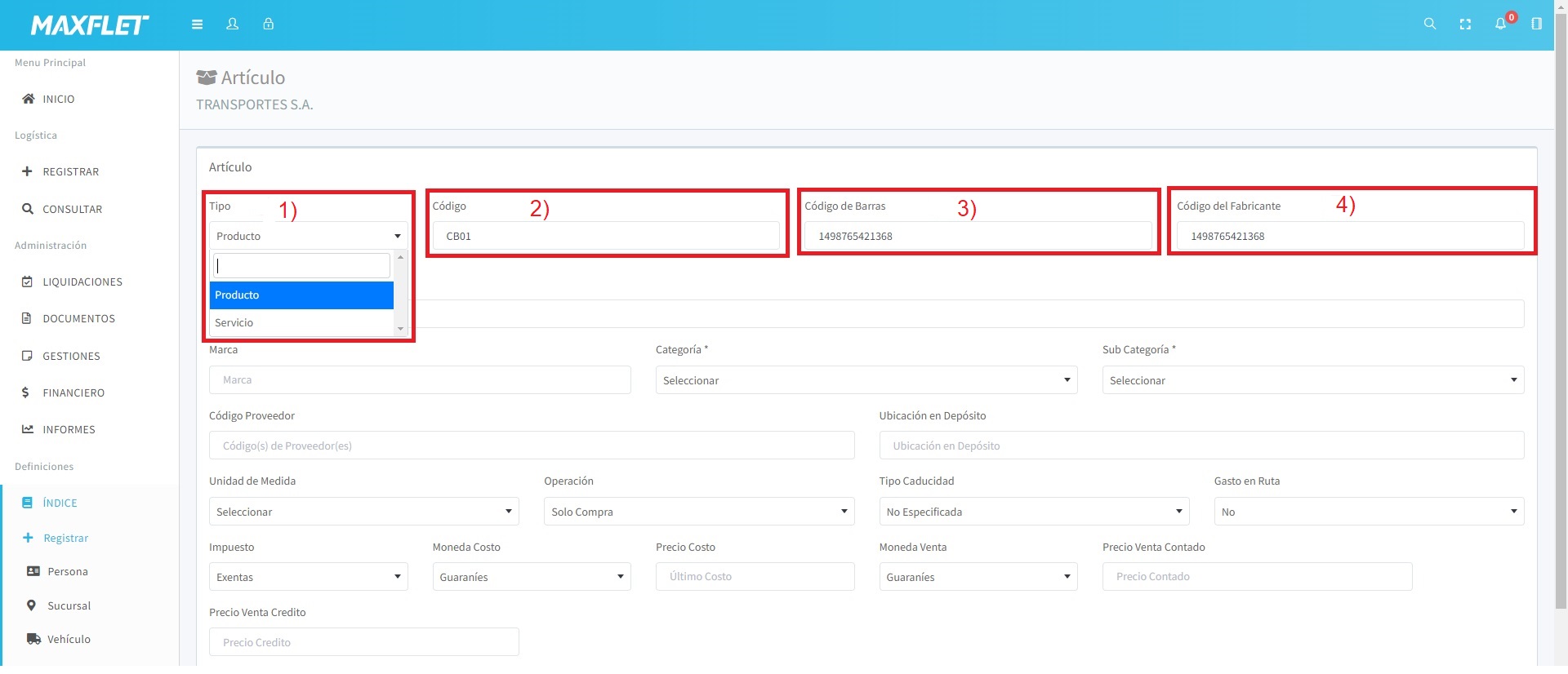 4) En el campo Código del Fabricante: Puede ingresar el código del fabricante, si es necesario, para facilitar una mejor identificación del artículo al momento de la compra.