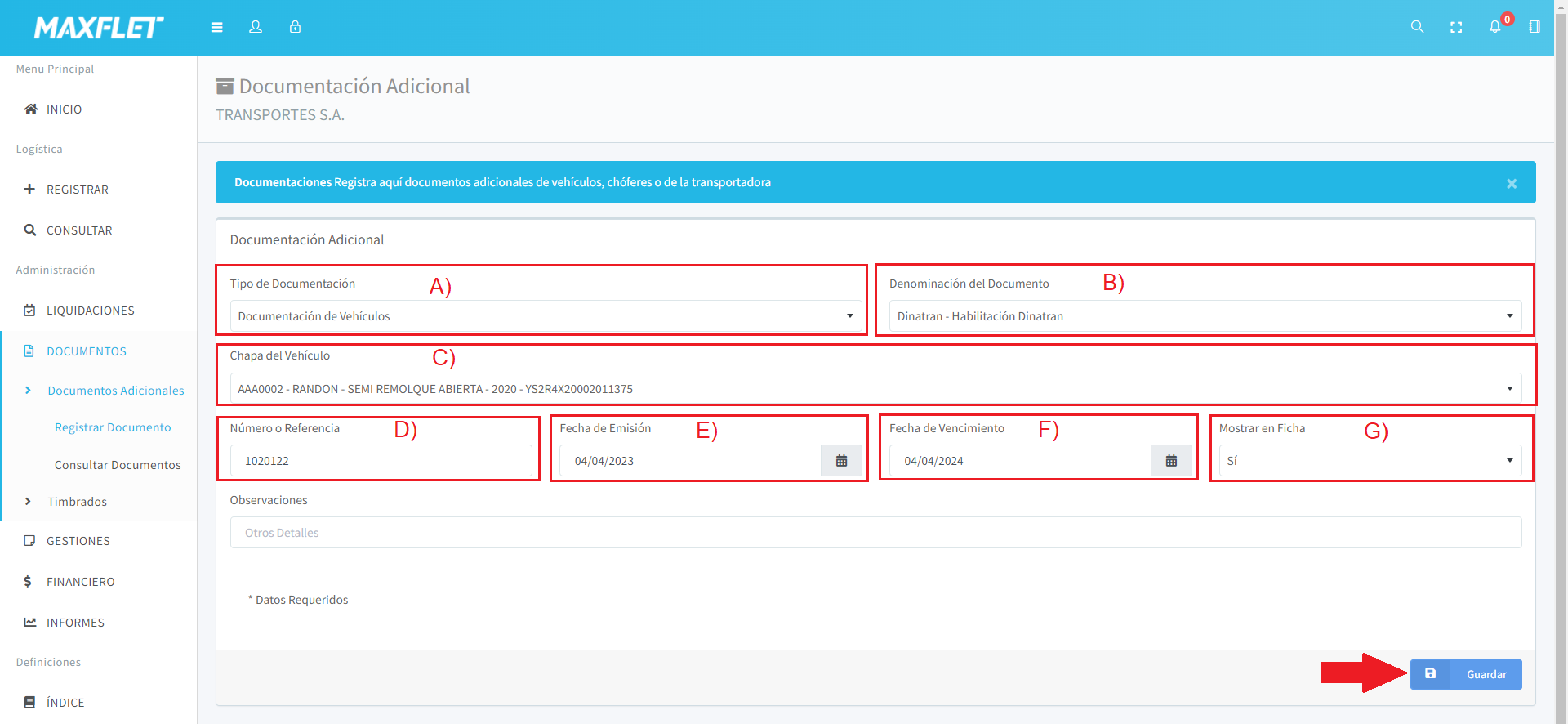 G) En el campo mostrar en ficha: Selecciona la opción ‘Mostrar en ficha’ para visualizar el documento en la ficha del vehículo