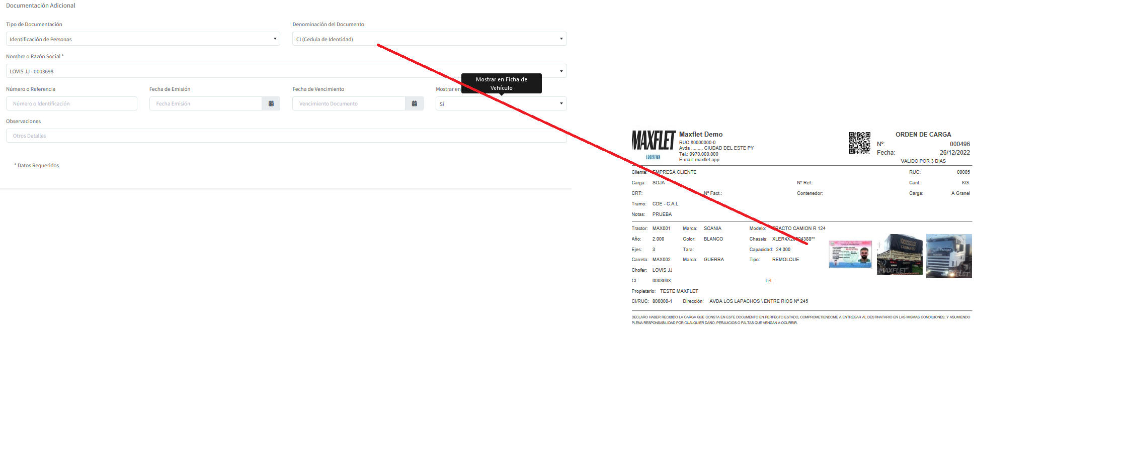 Agregando tipo de documento CI(cédula de identidad) del chofer y seleccionando la opción de imprimir en la ficha, podemos agregar la foto de documento del mismo para que imprima en la orden de carga.
