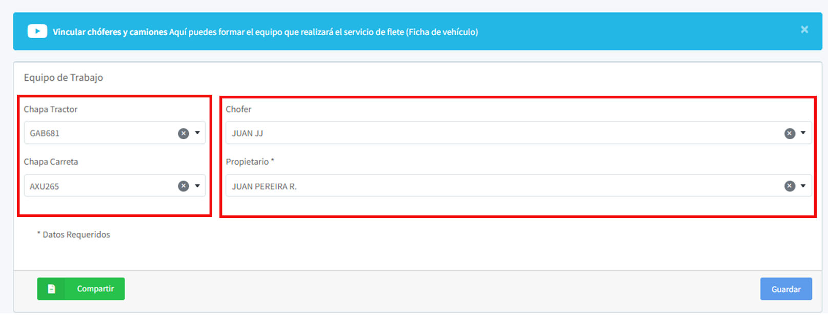 Observaciones: Si la chapa del tractor (camión) ya tiene un propietario, un chofer o está vinculado a una carreta, el sistema completará automáticamente los campos mencionados anteriormente.