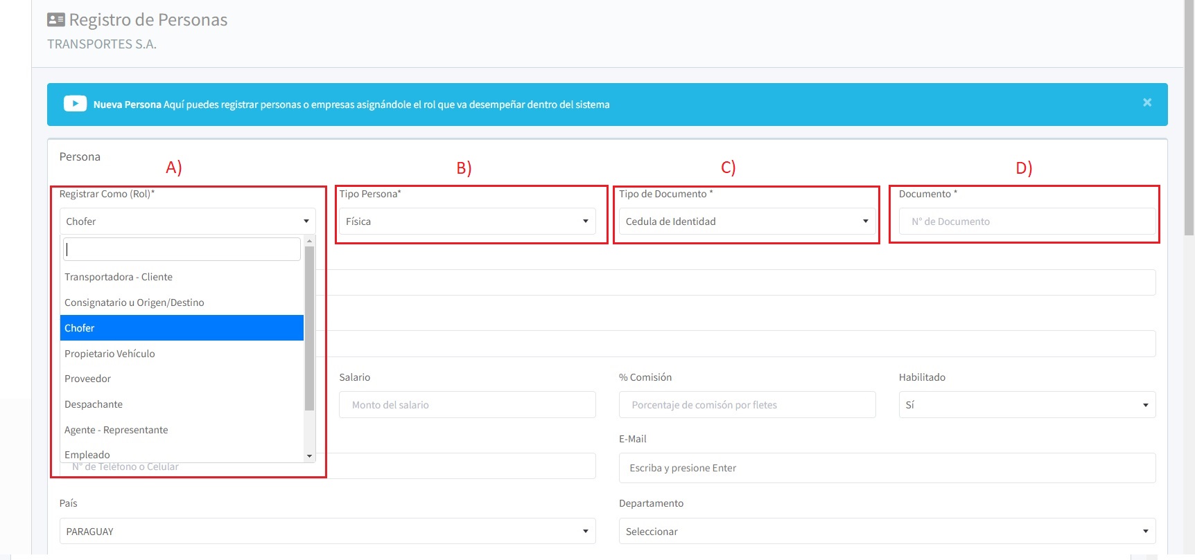 A) En el campo Registrar Como (Rol):Haz clic en la opción desplegable o selecciona el campo correspondiente para elegir el rol o función adecuada. Dentro de las opciones disponibles, selecciona el rol que la persona o empresa cumplirá. Algunos ejemplos: Transportadora-Cliente, consignatario u origen y destino, chofer, Propietario de vehículo y entre otros roles