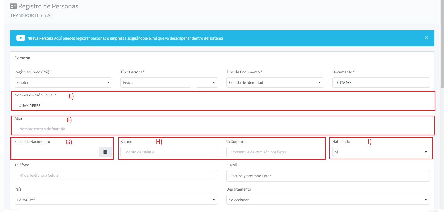 H) En los campos salario y % comisión: Si la persona que estás registrando es un chofer o un empleado de la empresa, aparecerán los campos “Salario” y “% Comisión”. En el caso de un chofer propio, debes especificar el monto del salario o el porcentaje de comisión que corresponda. En el caso de un tercero, es decir, una persona externa a la empresa, no es necesario especificar nada en esos campos.