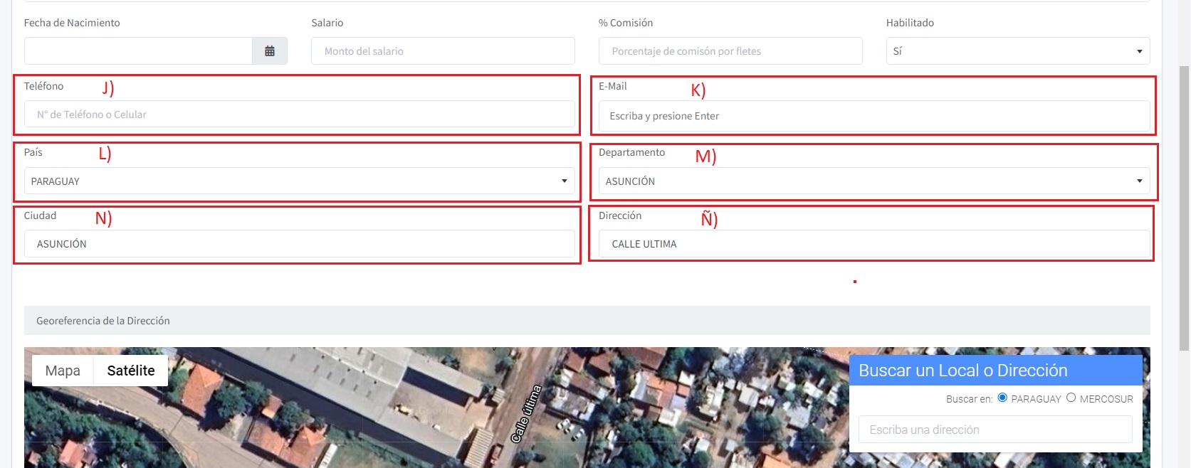 Para ingresar la dirección, contamos con dos opciones. La primera es escribir manualmente los campos correspondientes a País, Departamento, Ciudad y Dirección. La segunda opción es utilizar la función de búsqueda en el mapa, donde el sistema autocompletará automáticamente los campos de País, Departamento, Ciudad y Dirección, basándose en la ubicación seleccionada en el mapa.