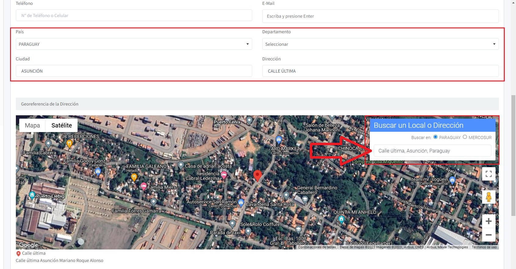 Una vez que hayas encontrado y seleccionado la ubicación deseada en el mapa, el sistema automáticamente llenará los campos de país, departamento, ciudad y dirección con la información correspondiente.