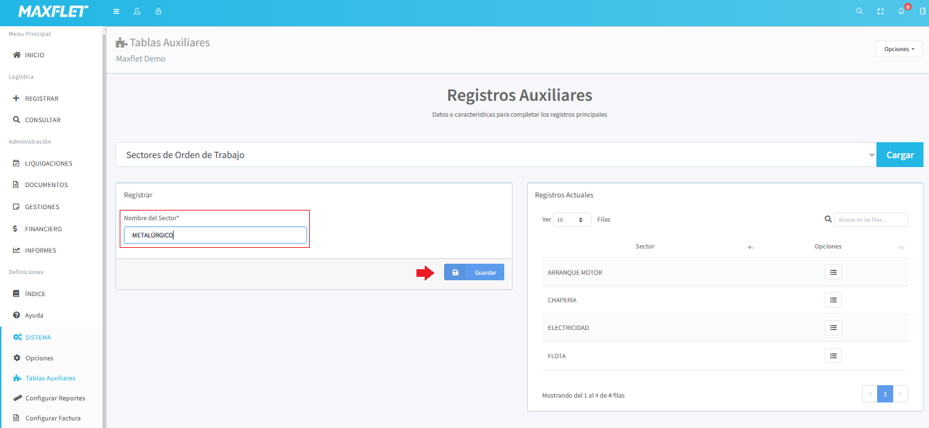 Para registrar el sector en la casilla Nombre del Sector agregamos el nombre del sector a registrar y Guardamos, el sistema confirmará el nuevo sector y listo!