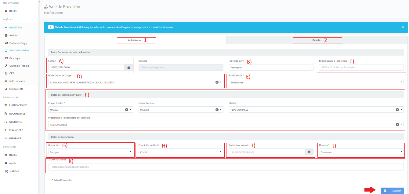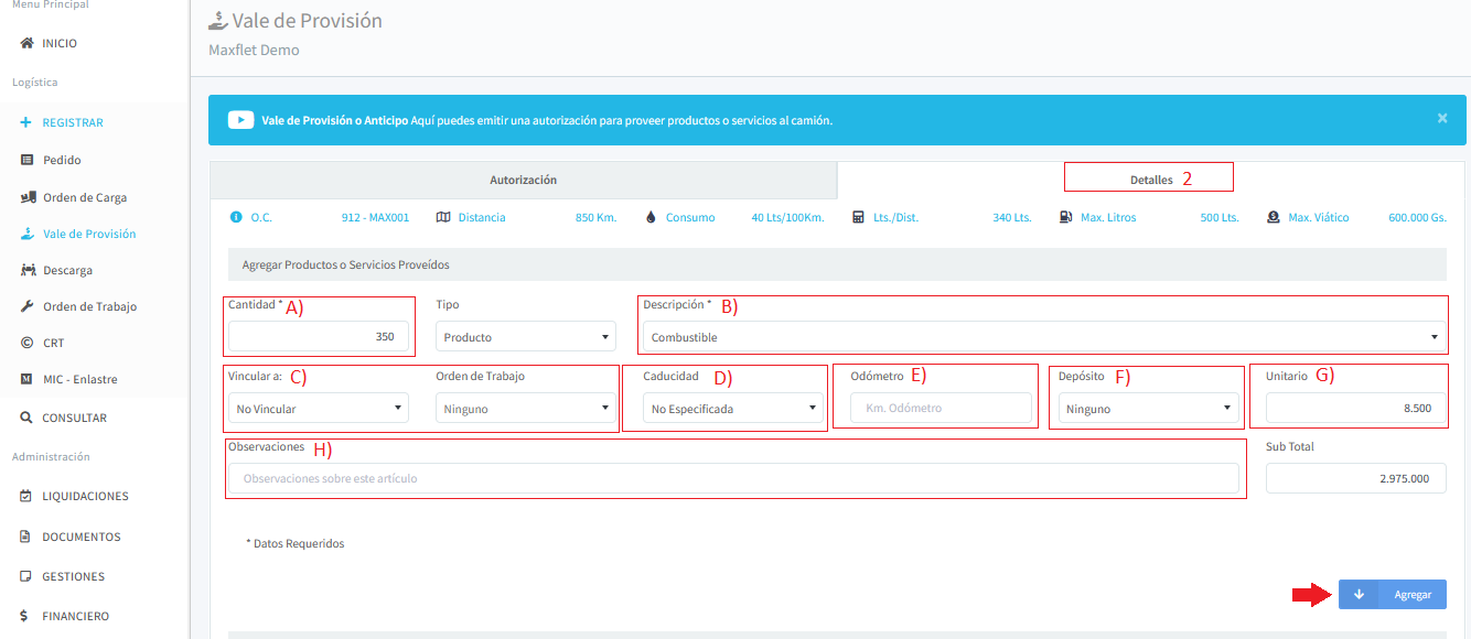 Para agregar los detalles del vale procedemos a completar los siguientes campos: