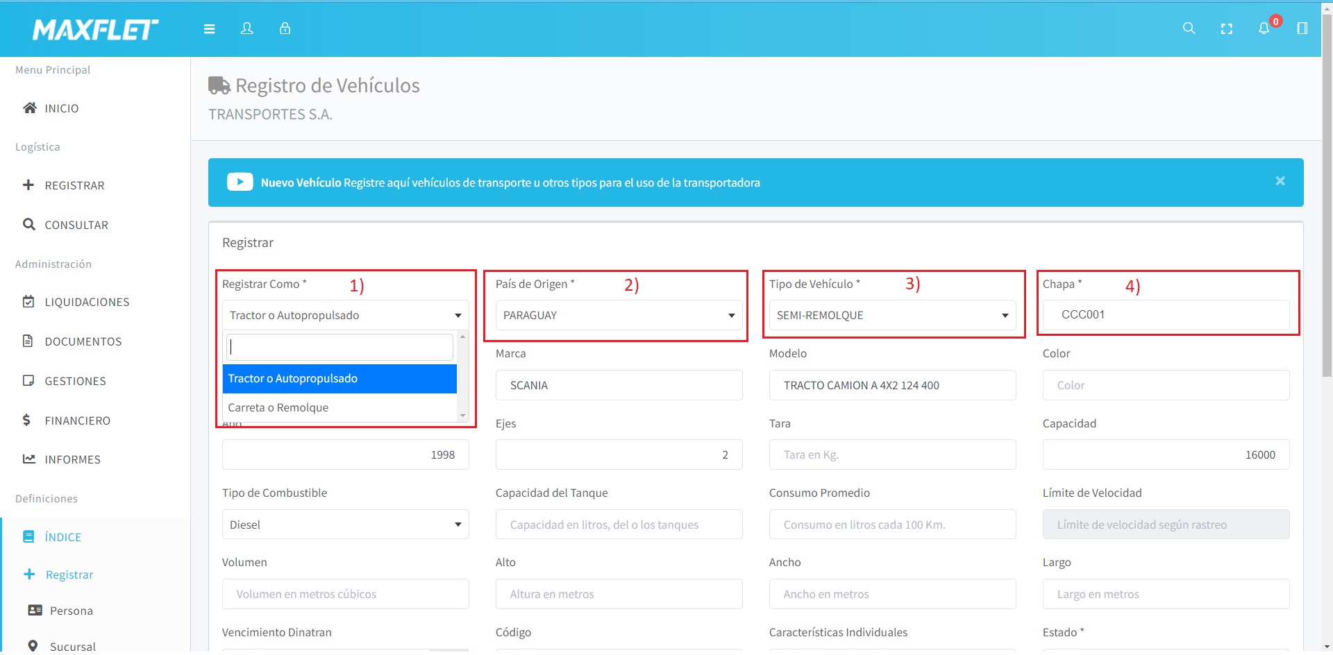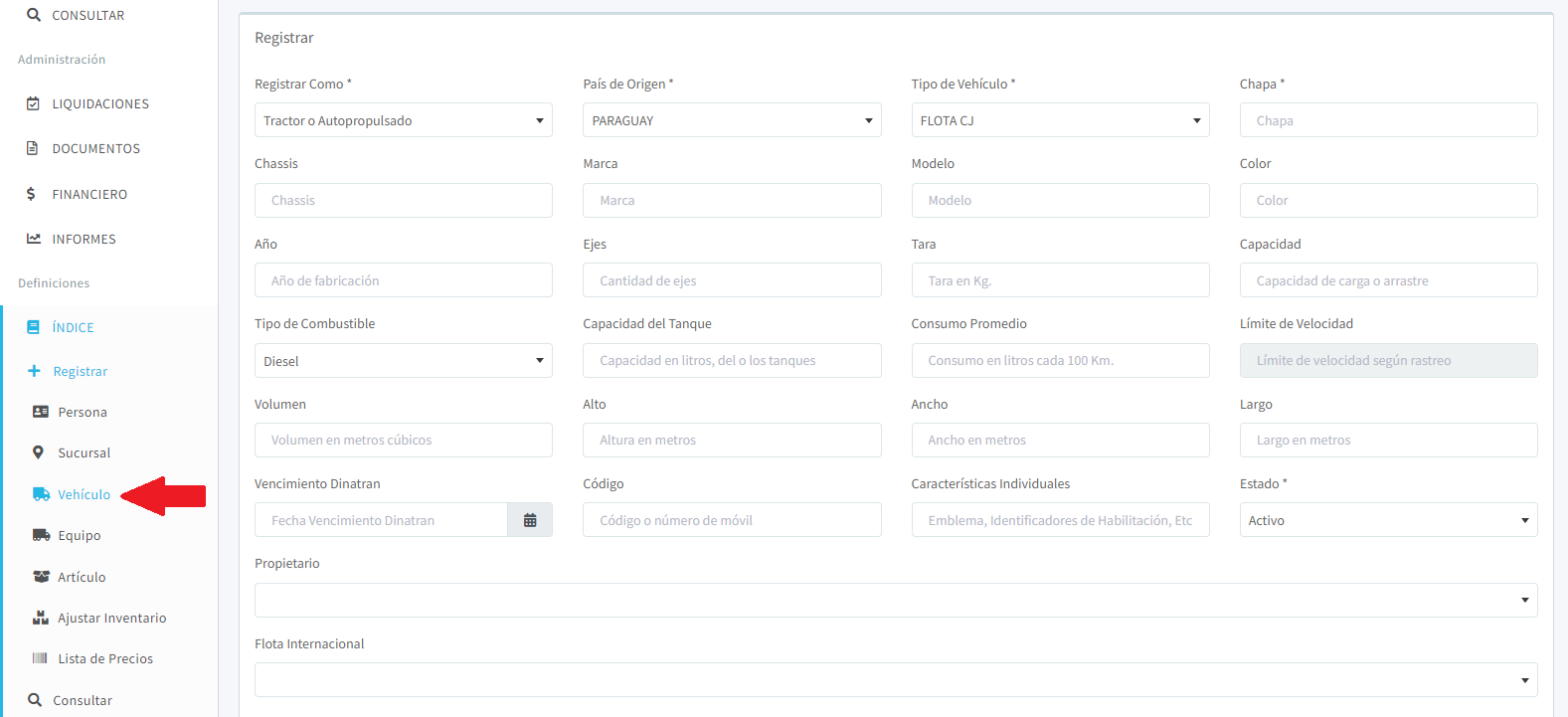 Nos dirigimos al menú: Índice -> Registrar -> Vehículo.