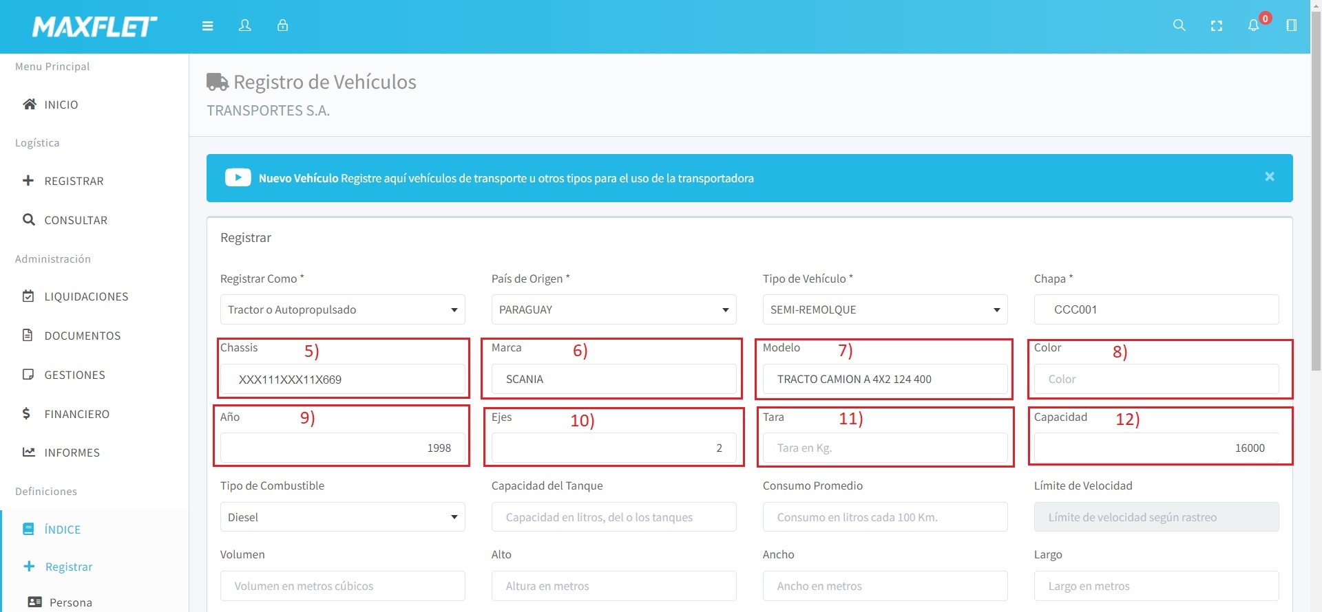 5) Chasis: 6) Marca 7) Modelo: 9) Año: 10) Ejes: 12) Capacidad