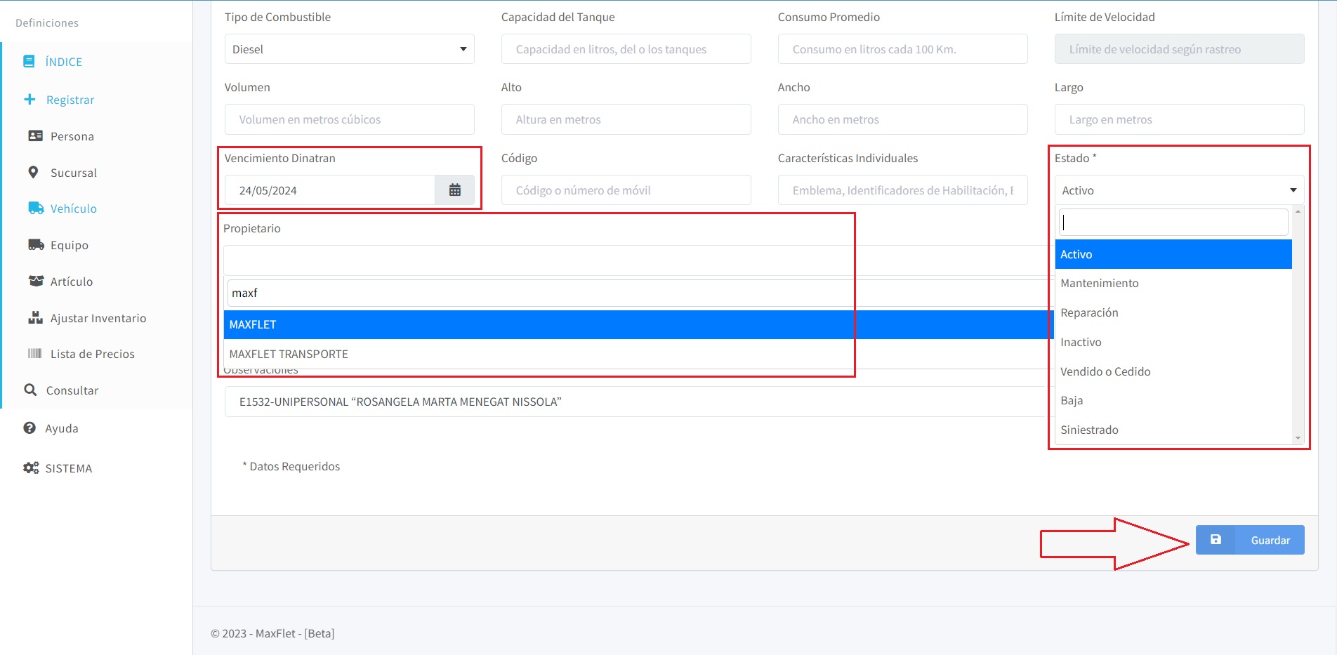 Podemos seleccionar el estado del vehículo, como activo, en mantenimiento, en reparación, entre otros.