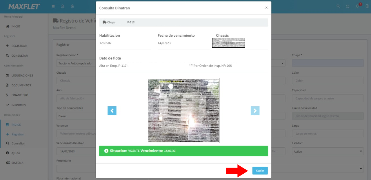 Si la chapa consultada existe en los registros de Dinatran, el sistema abrirá una ventana donde se mostrarán los datos y las fotos registrados al momento de gestionar la habilitación del vehículo. Al hacer clic en el botón Copiar, se completarán automáticamente algunos campos en el registro del vehículo.